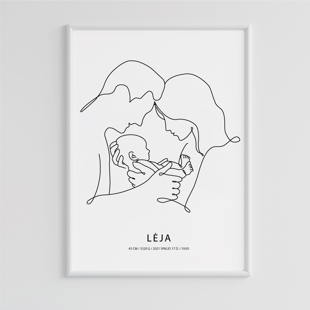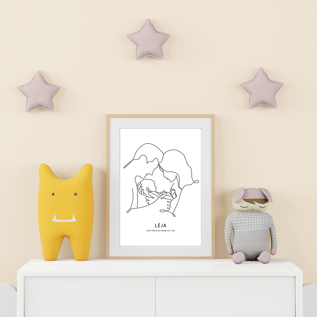 Stilingo dizaino kūdikio metrikų plakatas. Gražiai papuoš vaikučio kambarį, puikiai tiks krikštynų ar gimtadienio dovanai.