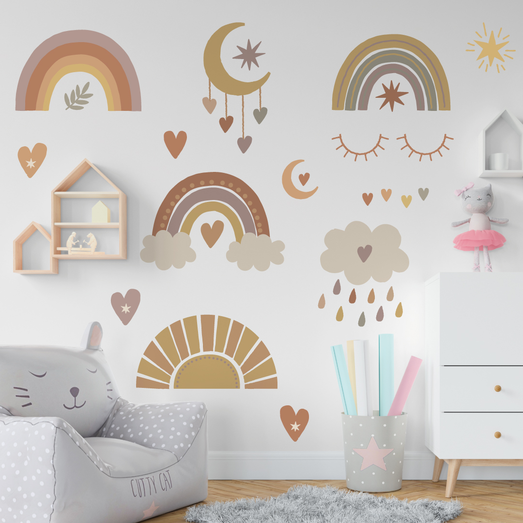 Vaikų kambario sienų lipdukas su vaivorykštėmis.