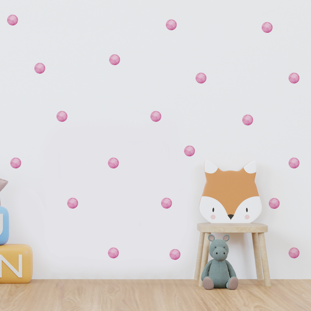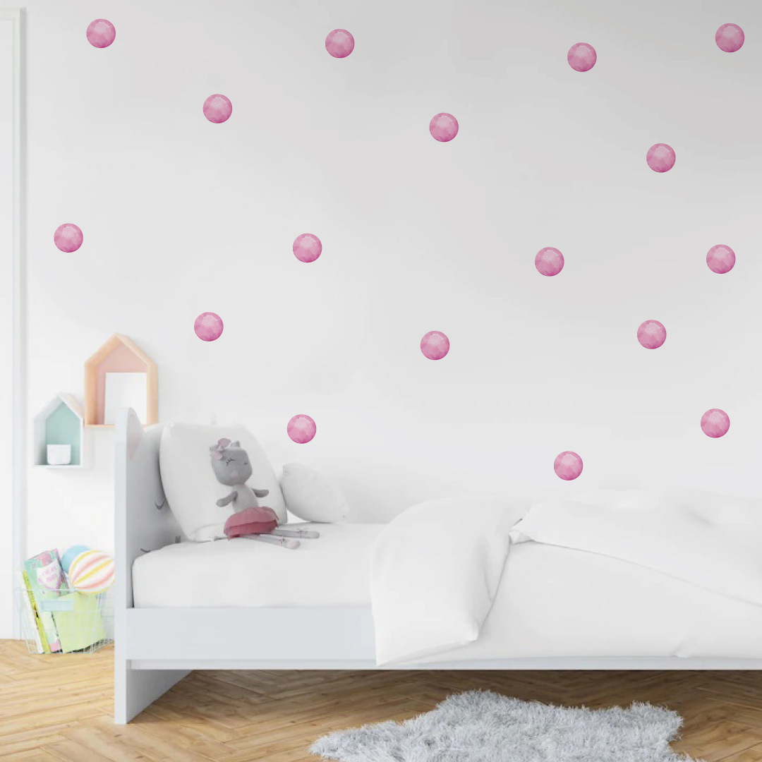 Vaikų kambario sienų lipdukas su rausvos spalvos burbuliukais.