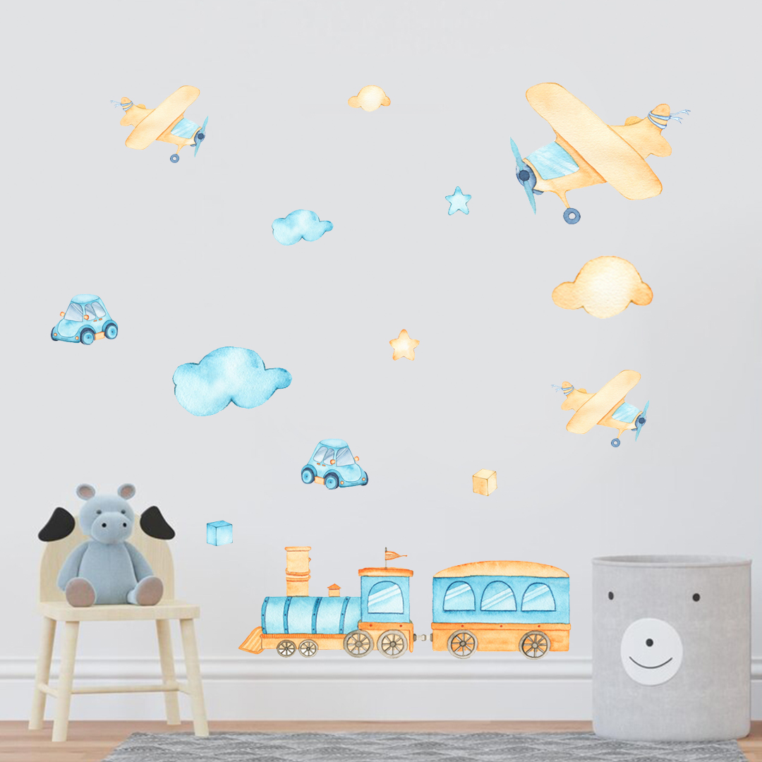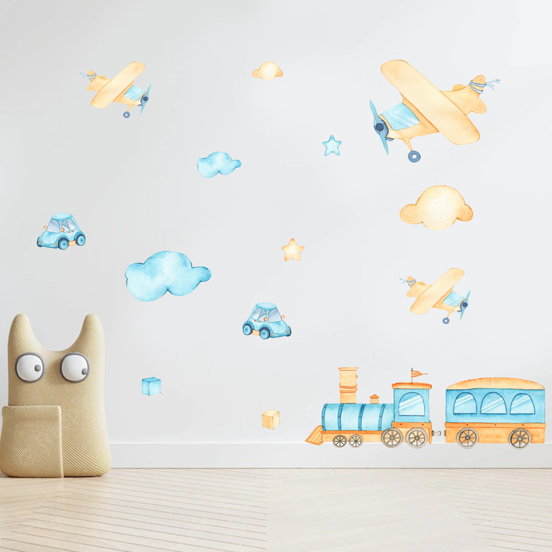 Vaikų kambario sienų lipdukas su lėktuvais, mašinytėmis ir traukiniu.